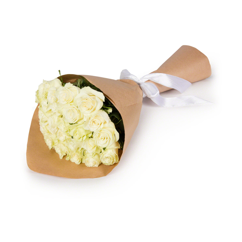 Изысканный букет из 7 белоснежных роз в стильной крафтовой упаковке — воплощение чистоты и совершенства.