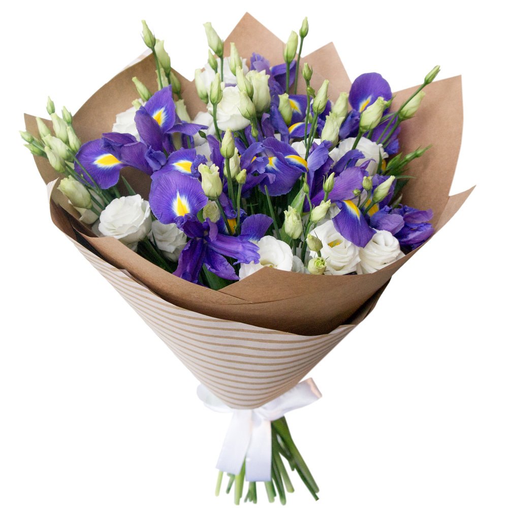 Утонченная композиция из свежих синих ирисов и нежных белых эустом – воплощение элегантности и чистоты. Идеальный выбор для особых моментов. Цветы с доставкой Рязань.