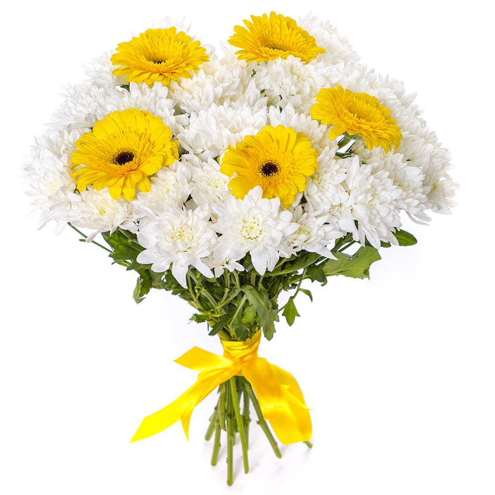 –Солнечный букет из желтых гербер и белых хризантем – радость в каждом лепестке